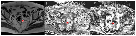 Woman 65 y.o. with rectal cancer (same patient as in Figure 2). Tumor deposit (arrow) assessed in T2W sequence (A), in MK map (B) and MD map (C).