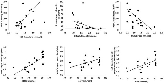 The three cell dynamic parameters (displacement, trajectory, and persistency) correlated significantly with eGFR (mL/min) (r = 0.74, p < 0.001; r = 0.48, p = 0.031; r = 0.58, p = 0.008, respectively). However, no correlations were found between DC parameters and albumin (mg/L) measures (p > 0.67).