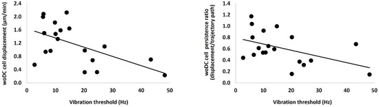 In individuals with T1D, two cell dynamic parameters (displacement and persistency) correlated inversely with vibration threshold (Hz) (r = −0.46, p = 0.045 and r = −0.45, p = 0.046, respectively) (Figure 4). There were no other associations between DC parameters and neuropathy measures.