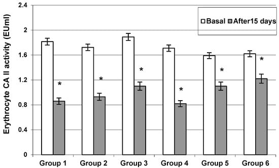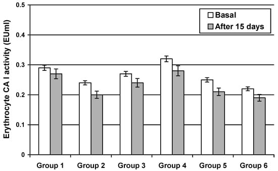 Differentiation of carbonic anhydrase I from carbonic anhydrase II activity in erythrocytes was performed by testing with nicotinates [], which relies on the selective inhibition of carbonic anhydrase I activity induced by methyl nicotinate at a concentration of 10−4 M. Total CA activity was assayed and noted as Total CA. Methyl nicotinate at a concentration of 5 × 10−4 M was associated with the same sample. At this level of concentration, CA I activity was completely inhibited. Afterwards, CA activity in the sample was measured again. This represented the value of CA II activity. From the Total CA activity, the value of CA II activity was subtracted, and the value of CA I activity was obtained.