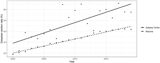 Over the period 2000–2019, the mean CS rate for the epilepsy centre was 47.1 (SD 14.26; range 18.92–65.67) and was significantly higher than the mean CS rate for the Mazovia County population—32.35 (SD 7.7; range 18.95–42.09), p = 0.001. The annual CS rates for the epilepsy centre and the Mazovia population over the 20 years are shown in Figure 1. According to regression analysis, CS rates were significantly affected by both the year and source of the delivery data (WWE cohort and the general population of Mazovia). Among the WWE at the epilepsy centre, there was an increase in the CS rate from 18.92% to 57.58%, with a linear increase of 1.89% annually (95% confidence interval (CI): 1.15–2.63, p < 0.001), over the 20-year study period. In the Mazovia County population, the CS rate increased from 18.95% to 41.71%, with a linear increase of 1.28% annually (95% CI: 1.19–1.38, p < 0.001) in the years 2000–2019.