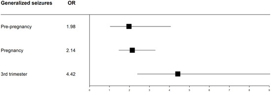 Likelihood of caesarean section according to the occurrence of generalized seizures pre-pregnancy, throughout the entire pregnancy, and in the 3rd trimester. Odds ratios (ORs) for caesarean section are presented as a forest plot with corresponded 95% confidence interval.