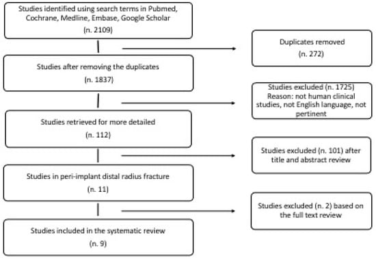 Nine manuscripts fulfilled the inclusion criteria and were included in the review [6,7,8,9,10,11,12,13,14] (Table 1 and Figure 1). The articles included in this review were all case report studies (nine patients). In four patients, hardware failure occurred after small efforts or low energy traumas [6,7,8,12]; in four cases, the new fracture occurred a few months after the fixation and along the old line of fracture [6,7,8,14]. Loss of reduction with implant failure was presented in two cases without trauma or particular efforts [13,14]. In one case, the fixation failure occurred after seven days [13]. The causes of these fractures were due to delayed union/non-union (promoted by patient’s comorbidity or by smoking habit) or to implant design failure (high rigidity of the hardware, number and direction of proximal and distal locking screws). In four patients, the fractures occurred years later from the primary surgery when the old fracture was already healed [9,10,11,12]. In this case, fractures occurred following a high energy trauma (three patients) and in a patient affected by osteoporosis and poor bone quality.