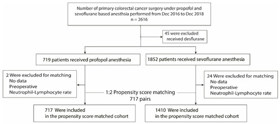 Therefore, we hypothesized that patients receiving propofol-based total intravenous anesthesia would have a superior inflammatory response and thereby less tumor recurrence compared to sevoflurane-based inhalational anesthesia after colorectal cancer surgery. The primary endpoint was NLR, which were compared between the two groups that had received propofol or sevoflurane as the main anesthetic agent. Secondary outcomes were early postoperative complications and recurrence-free survival and overall survival.