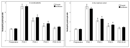 Change of neutrophil-lymphocyte ratio in the perioperative period. POD; postoperative day. * means p < 0.05 when compared with logistic regression using generalized estimating equations with Bonferroni correction in a propensity score matched cohort.