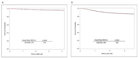 (A) Overall survival curves from the date of surgery by anesthesia type in the propensity score matched cohort. (B) Recurrence-free survival curves from the date of surgery by anesthesia type in the propensity score matched cohort. (red line: propofol received, blue line: sevoflurane received).