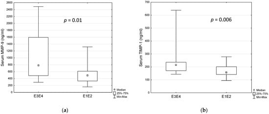 | MMP-9 serum (ng/mL) | 508.6 (160.2–2486.8) | 322.7 (125.5–937) | p = 0.01 |
