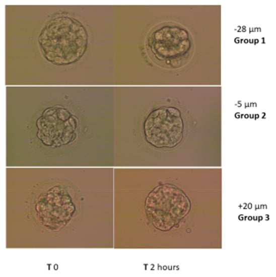During the study period, 115 thawed blastocysts from 115 patients met the selection criteria: group 1 included 37 embryos (32.2%), group 2 included 37 (32.2%) embryos and group 3 included 41 (35.7%) embryos. Examples of the measurements and group criteria are represented in Figure 2.