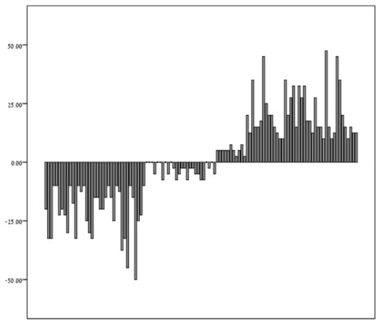 Histogram illustrating changes in size between the two-hour diameter and immediate post-thaw diameter for each of 115 embryos (µm).