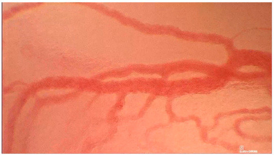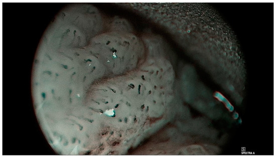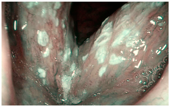 A few classification systems have been developed, and some of them can be used with white light endoscopy while others require enhanced imagining such as NBI. However, the proper NBI examination is difficult and sometimes impossible due to the “umbrella effect” [13]. This phenomenon causes the reflection of the light emitted from the light source. Therefore, the emitted light does not reach the IPCLs in the mucosa, which limits examination [13]. Nevertheless, vascularization around the leukoplakia can be observed and can yield important information about the observed lesion. It can be classified according to one of the available classifications. According to multiple authors, changes in the vascular architecture surrounding the primary lesion yield valuable information about the features of the lesion [13,19]. Stanikova et al. reported that perpendicular vascularization surrounding the leukoplakia was associated with malignant lesions (carcinoma in situ or invasive carcinoma). This was histologically confirmed in 84.6% of cases [19]. Leukoplakia surrounded by longitudinal type of vascularization was histologically benign (hyperkeratosis or low-grade dysplasia) in 83.8% of cases [19]. The authors also suggest that leukoplakia with favorable surrounding findings in NBI endoscopy can be followed conservatively without surgical intervention [19].
