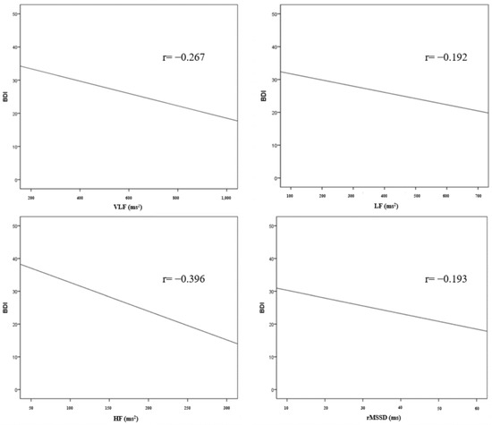The results of the correlation analysis between the HRV parameters and BDI are shown in Table 5 and Figure 1. In the frequency domains of the HRV parameters, there was a statistically significant correlation between BDI and VLF (r = −0.267, p = 0.002), LF (r = −0.192, p = 0.025), and HF (r = −0.396, p < 0.001). There was no statistically significant correlation between the BDI and LF/HF ratio. In the time domain, BDI and rMSSD (r = −0.193, p = 0.025) showed a statistically significant correlation. There was no statistically significant correlation in SDNN, SDANN, ASDNN, and pNN50.