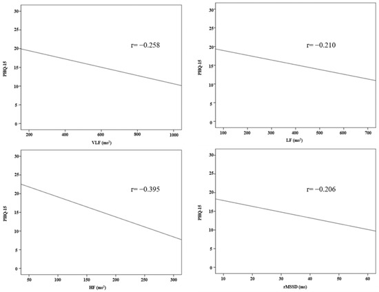 The results of the correlation analysis between the HRV parameters and PHQ-15 are shown in Table 6 and Figure 2. In the frequency domains of the HRV parameters, there was a statistically significant correlation between PHQ-15 and VLF (r = −0.258, p = 0.002), LF (r = −0.210, p = 0.014), and HF (r = −0.395, p < 0.001). There was no statistically significant correlation between the PHQ-15 and LF/HF ratio. In the time domain, PHQ-15 and rMSSD (r = −0.206, p = 0.016) showed a statistically significant correlation. There was no statistically significant correlation in SDNN, SDANN, ASDNN, and pNN50.