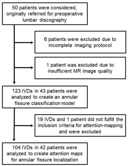 Statistical calculations were performed with MATLAB R2018a-R2020a. The available data in the original studies determined the current patient sample size. The classifiers were evaluated in terms of sensitivity, specificity, positive likelihood ratio and negative likelihood ratio. Further, a receiver operating characteristic analysis was performed. Using the mid-p-value McNemar test at a 5% significance level, it was tested whether the predictive accuracy of the ANN-based classifier was more accurate than using the conventional radiological marker HIZ to identify an outer annular fissure. In addition, the relative number of correct fissure localizations using attention mapping was determined. The intra- and interobserver reliability/agreement for the grading of the DDD, Pfirrmann categorization and segmentation were not evaluated here but in previous studies using current and other datasets [2,20].