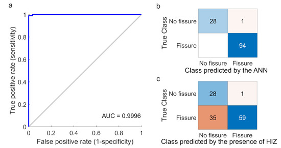 (a) Receiver operating characteristic (ROC) by logistic regression. Area under curve (AUC) value of 0.9996 was reached, indicating accurate diagnostic capability in separating intervertebral discs with and without outer annular fissures (blue line). (b) Confusion matrix displaying the classifying performance of the artificial neural network (ANN)-based classifier. The numbers of true positives (bottom right), true negatives (top left), false positives (top right) and false negatives (bottom left) are presented at a 0.5 cut-off score. (c) Confusion matrix displaying the classifying performance of using a high intensity zone (HIZ) as a marker to identify an outer annular fissure.