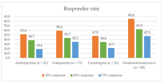 The drug with the highest 30%, 50%, and 75% response rate was onabotulinumtoxinA. Figure 2 shows the 30%, 50%, and 75% responder rate for the most frequently used drugs.