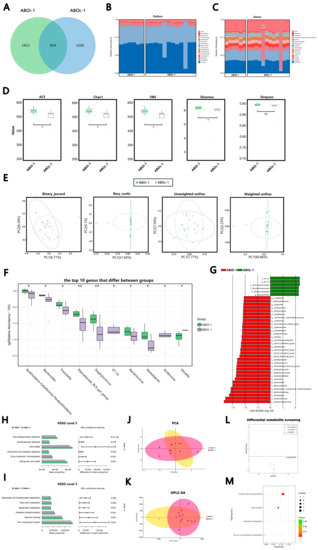 Analysis and comparison of bacterial communities and metabolomics between groups ABOi−1 and ABOc−1. (A) Venn diagram summarizing the number of common ASVs between the two groups. The composition and abundance distributions of the two groups at the (B) phylum and (C) genus levels. (D) The α-diversity (ACE, Chao1, OBS, Shannon and Simpson) between the two groups. (E) The β-diversity analysis was evaluated with the use of PCoA, which was calculated using the binary–Jaccard distance, Bray–Curtis distance and (un)weighted UniFrac distance. (F) The top 10 differential genera were detected between the two groups. For optimal visualization, a transformation of log10 (relative abundance × 100) was employed. (G) The histogram of the Lefse analysis revealed bacteria whose LAD score exceeded the default value of 2. Red represents the ABOi-1 group, and blue signifies the ABOc-1 group. The six significantly different KEGG pathways in (H) Level 2 and (I) Level 3 between groups ABOi-1 and ABOc-1 and (J) the PCA map. The distance of each coordinate point highlights the degree of aggregation and dispersion between the samples. (K) OPLS-DA map, where the abscissa is the predicted principal component representing the difference between the groups, and the ordinate is the orthogonal principal component, representing the difference within the group. (L) Volcano plot of the differential metabolites between the two groups. (M) KEGG pathway bubble chart of bile acid. The abscissa was the Rich factor, and the larger the value, the greater the enrichment. The ordinate signified the metabolic pathway with the highest degree of enrichment. The color of the dots stands for the p-value, and the redder it is, the smaller the p-value, indicating that the enrichment was more obvious. The size of the dot represents the number of differential genes in the pathway, and the larger the dot, the greater the number of differential genes. * p < 0.05 and ** p < 0.01.