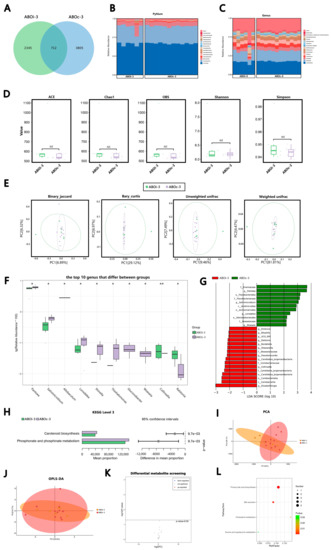 Analysis and comparison of the bacterial community and metabolomics between the the ABOi−3 and ABOc−3 groups. (A) Venn diagram summarizing the number of common ASVs between the two groups. The composition and abundance distributions of the two groups at the (B) phylum and (C) genus levels. (D) The α-diversity (ACE, Chao1, OBS, Shannon and Simpson) between two grIs. (E) The β-diversity analysis was evaluated with use of PCoA, which was calculated using the binary–Jaccard distance, Bray–Curtis distance and (un)weighted UniFrac distance. (F) The top 10 differential genera were detected between the two groups. For optimal visualization, a transformation of log10 (relative abundance × 100) was employed. (G) The histogram of LEfse analysis revealed bacteria whose LAD score exceeded the default value of 2. Red represents the ABOi-3 group, and blue represents the ABOc-3 group. (H) Top 6 significantly different Level 3 KEGG pathways between the two groups. (I) PCA map, where the distance of each coordinate point highlighted the degree of aggregation and dispersion between the samples. (J) OPLS-DA map, were the abscissa was the predicted principal component representing the difference between the groups, and the ordinate was the orthogonal principal component, representing the difference within the group. (K) Volcano plot of the differential metabolites between the two groups. (L) KEGG pathway bubble chart of bile acid, where the abscissa is the Rich factor, and the larger the value, the greater the enrichment. The ordinate signifies the metabolic pathway with the highest degree of enrichment. The color of the dots stands for the p-value, and the redder it is, the smaller the p-value, indicating that the enrichment was more obvious. The size of the dot represents the number of differential genes in the pathway, and the larger the dot, the greater the number of differential genes. * p < 0.05 and ** p < 0.01.