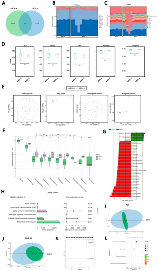 Analysis and comparison of the bacterial community and metabolomics between the ABOi−4 and ABOc-4 groups. (A) Venn diagram summarizing the number of common ASVs between the two groups. The composition and abundance distributions of the two groups at the (B) phylum and (C) genus levels. (D) The α-diversity (ACE, Chao1, OBS, Shannon and Simpson) between the two groups. (E) The β-diversity analysis was evaluated with use of PCoA, which was calculated using the binary–Jaccard distance, Bray–Curtis distance and (un)weighted UniFrac distance. (F) The top 10 differential genera were detected between the two groups. For optimal visualization, a transformation of log10 (relative abundance × 100) was employed. (G) The histogram of the LEfse analysis revealed bacteria whose LAD score exceeded the default value of 2. Red represents the ABOi-4 group, and blue represents the ABOc-4 group. (H) Top 6 significantly different Level 3 KEGG pathways between the two groups. (I) PCA map, where the distance of each coordinate point highlights the degree of aggregation and dispersion between the samples. (J) OPLS-DA map, where the abscissa is the predicted principal component representing the difference between the groups, and the ordinate was the orthogonal principal component, representing the difference within the group. (K) Volcano plot of the differential metabolites between the two groups. (L) KEGG pathway bubble chart of bile acid, where the abscissa is the Rich factor, and the larger the value, the greater the enrichment. The ordinate signifies the metabolic pathway with the highest degree of enrichment. The color of the dots stands for the p-value, and the redder it is, the smaller the p-value, indicating that the enrichment was more obvious. The size of the dot represents the number of differential genes in the pathway, and the larger the dot, the greater the number of differential genes. * p < 0.05, *** p < 0.001.