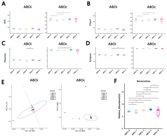 Longitudinal analysis of the biliary microbiota in ABOi LT and ABOc LT. Contrast of the alpha diversity variation with the use of (A) ACE, (B) Chao1, (C) Shannon and (D) Simpson. (E) The results of the PCoA variation of the biliary microbiota in ABOi LT and ABOc LT. (F) Changes in the relative abundance of Bacteroidetes in ABOc LT. * p < 0.05, ** p < 0.01.