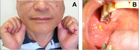 - Watanabe, S.; Hata, S.; Nakajima, J.; Yokoe, H.; Sato, Y. A case of pneumoparotid caused by strong pressure with an air syringe. J. Jpn. Stomatol. Soc. 2014, 63, 106–107. [Google Scholar]