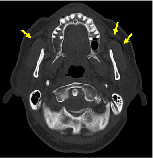 Air in the bilateral parotid glands and ducts (yellow arrows) in an axial-section computed tomography (CT) scan.