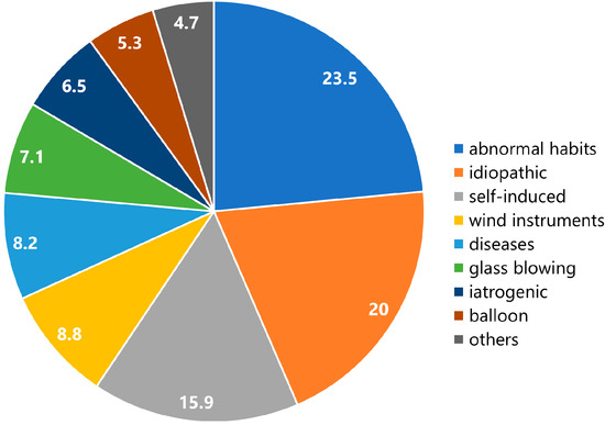 The percentage of each etiology in all patients is shown in Figure 4. The etiologies included abnormal habits (n = 39), idiopathic (n = 34), self-induced (n = 28), wind instruments (n = 15), diseases (n = 14), glass blowing (n = 12), iatrogenic (n = 11), balloon (n = 9), and others (n = 8).