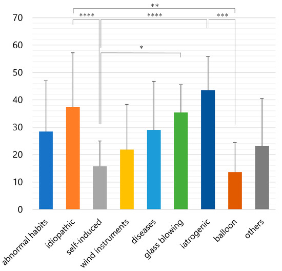 Figure 5 shows a comparison of the mean age between etiologies. The mean ages were as follows, abnormal habits; 28.4 ± 18.5 years, idiopathic; 37.4 ± 19.8, self-induced; 15.7 ± 9.3, diseases; 29 ± 17.7, wind instruments; 21.8 ± 16.5, glass blowing; 35.4 ± 10.1, iatrogenic; 43.5 ± 12.3, balloon;13.6 ± 10.8, and others; 23.2 ± 17.3. The mean age of each etiology differed significantly (p < 0.001, one-way analysis of variance). Self-induced patients (15.7 ± 9.3 years) were significantly younger than iatrogenic patients (43.5 ± 12.3 years, p < 0.001), idiopathic patients (32.4 ± 19.3 years, p < 0.01), and glass blowers (35.4 ± 10.1 years, p < 0.05) (Figure 5). Balloon blowers (13.6 ± 10.8 years) were significantly (p < 0.005) younger than iatrogenic patients (43.5 ± 12.3 years) and idiopathic patients (37.4 ± 19.8 years, p < 0.005).