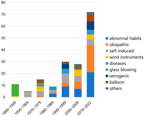 Figure 6 shows the change in number of cases for each etiology since 1890. The number of reported cases has increased. The causes of the disease have drastically changed over time. Glass-blowing was the predominant cause in the early days; however, it completely disappeared after the latter half of the 20th century. Conversely, iatrogenic cases have increased since the 1990s. In addition, cases of abnormal habits and idiopathic causes are growing rapidly. Cases related to self-induction, diseases, wind instruments, and balloons are found regardless of time.
