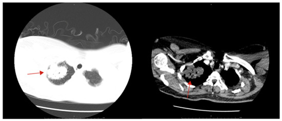 Chest CT showed a mass in the right upper lung (solid red arrow).