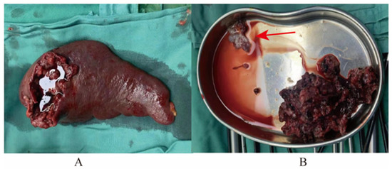 Emergency laparoscopic exploration was performed after preoperative preparation. During the operation, a large amount of blood accumulated in the abdominal and pelvic cavities, especially in the splenic fossa, and a large number of blood clots could be seen in the splenic fossa. On the surface of the spleen, we found gestational sac-like tissue, which fell off to the omentum majus in the process of exploration, and the tissue was broken in the process of clamping, so no complete specimen was obtained. No obvious focus or bleeding was found in the exploration of the uterus, bilateral fallopian tubes and ovaries, and then a laparotomy was performed. After entering the abdomen, approximately 1000 mL of bloody fluid in the abdominal and pelvic cavities was absorbed. A 4 × 4 cm fissure was seen on the diaphragmatic surface of the spleen, and villous-like tissue was attached around it. Then, the spleen and part of the omentum majus were removed completely (Figure 3A,B). The total blood loss was approximately 1500 mL, and the patient was transfused with 1.5 U of AB-type red blood cells during the operation.