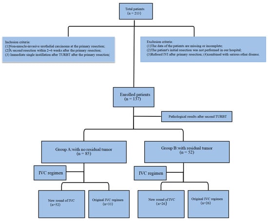 A retrospective analysis was performed on 137 patients who underwent a second TURBT at the Affiliated Hospital of Xuzhou Medical University between April 2014 and June 2022. The inclusion criteria were as follows: (1) first TURBT pathology was clearly uroepithelial carcinoma of the bladder, and NMIBC with Tis, Ta, or T1 stage was diagnosed on pathology at the initial resection; (2) patients who visited our hospital for a second resection within 2-6 weeks after the primary surgery; (3) immediate bladder perfusion therapy was performed within 24 hours after the primary resection, and thereafter, once a week; (4) the risk groups of patients were intermediate-risk or high-risk. The exclusion criteria were as follows: (1) patient data were missing or incomplete; (2) the patient’s initial resection was not performed at our hospital; (3) patient refused IVC or Bacillus Calmette-Guérin (BCG) was perfused after the primary resection; (4) underlying co-morbidities. During the second TURBT, all visible tumors and scars from the previous surgery were resected. A single chemotherapeutic drug was used for IVC in each patient. Based on the pathological findings, patients were divided into two groups: group A patients, who did not have a residual tumor on pathological examination after the second TURBT; and group B patients, who had residual tumor. The patients in both groups received two different IVC regimens. Individual regimens are carefully described in the treatment schedule. After the second TURBT, recurrence was determined using cystoscopy and imaging every 3 months. The endpoint was recurrence-free survival (RFS). RFS was defined as the duration from the date of a second TURBT to relapse, progression, or post-surgical death.