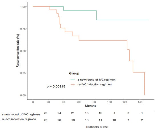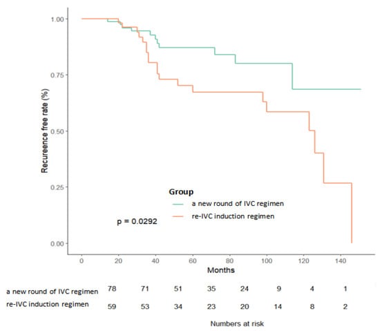 The median follow-up periods were 41 and 67 months in groups A and B, respectively. Approximately 31% and 29% of patients in groups A1 and A2, respectively, experienced tumor recurrence. The recurrence rates in group B were 29% (group B1) and 44% (group B2). In the entire cohort, there was a statistically significant difference in the RFS between patients in the two IVC regimens (p = 0.029) (Figure 2). The RFS of patients in group B1 was significantly lower than that of patients in group B2 (p = 0.009) (Figure 3). There was no significant difference in RFS between the subgroups A1 and A2 (p = 0.560).