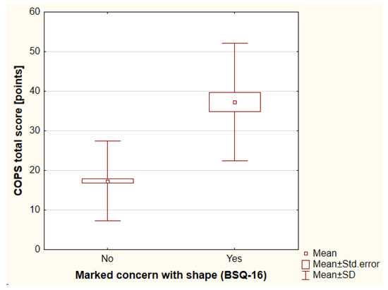 The differences in the COPS total score between individuals with marked concern with shape and without such concern. COPS—the Cosmetic Procedure Screening Questionnaire, BSQ-16—the Body Shape Questionnaire-16, SD—standard deviation.