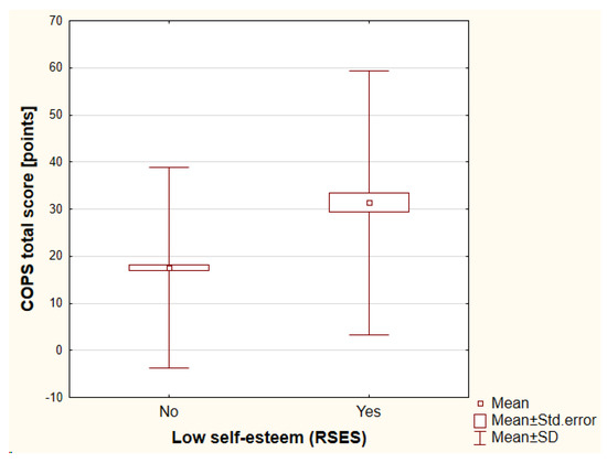 The differences in COPS total score between individuals with low self-esteem versus high self-esteem. COPS—the Cosmetic Procedure Screening Questionnaire, RSES—the Rosenberg Self Esteem Scale, SD—standard deviation.