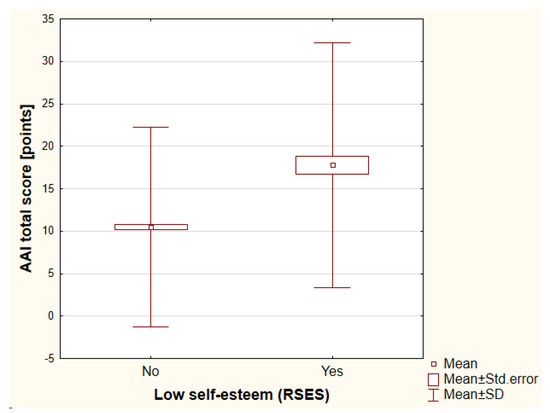 Self-esteem was assessed by the RSES. The mean value of the RSES total score was 20.98 ± 5.44 points (range, 2–30 points). A low self-esteem was reported by 48 individuals (11.65%). The lower self-esteem that was assessed with the RSES total score was dependent on a history of psychiatric treatment (antidepressants vs. no antidepressants: 18.32 ± 6.62 points vs. 21.30 ± 5.21 points, respectively [p < 0.01]; antipsychotics vs. no antipsychotics: 17.35 ± 5.61 points vs. 21.18 ± 5.36 points, respectively [p < 0.01]). The higher the financial status, the higher the self-esteem that was noted (p < 0.001). Once again, a history of cosmetic procedures and treatment satisfaction did not influence the self-esteem (detailed data not shown). It is worth underlining that according to the COPS, 14 out of 48 individuals (29.17%) with low self-esteem were suspected significantly more frequently for BDD (p < 0.001) and according to the AAI, it was 18 out of 48 individuals (37.5%) (p < 0.001) (Figure 3 and Figure 4). No significant differences were found between the genders.