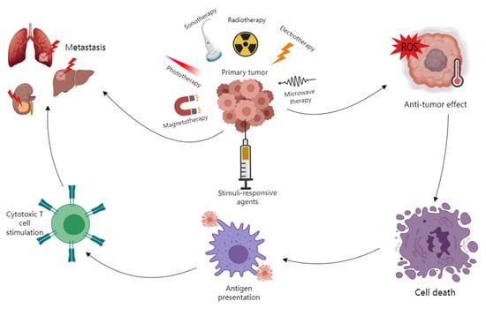 Demonstration of external stimuli-responsive therapies. External stimuli such as light, radiation, microwave, alternative magnetic field (AMF) and ultrasound (US) induce the generation of heat or reactive oxygen species (ROS), thus resulting in tumor death. Antigens are released upon tumor death and captured by antigen-presenting cells, which further trigger cytotoxic immune cell activation against metastatic tumors.