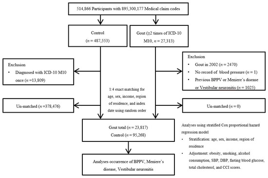 Participants with gout were selected from 514,866 participants with 895,300,177 medical claim codes from 2002 through 2019 (n = 27,313). The control group was defined as including participants who were not defined as having gout from 2002 through 2019 (n = 487,553). To select the participants with gout who were diagnosed for the first time, participants with gout diagnosed in 2002 were excluded (washout period, n = 2470). Participants with gout who had no records of blood pressure were excluded (n = 1). Control participants were excluded if the participants were diagnosed with the International Classification of Diseases, 10th revision code of M10 s (n = 13,809). Participants with gout were matched at a 1:4 ratio for age, sex, income, and region of residence. A random number order was used to sort the control participants, who were then selected from top to bottom. Therefore, we assumed that the matched control participants were evaluated at the same time as the matched participants with gout (index date); for this reason, we excluded participants in the control group who died before the index date. In both the control and gout groups, participants with a history of BPPV, Meniere’s disease, or vestibular neuronitis prior to the index date were excluded; for this reason, 1025 participants were excluded from the gout group. The matching procedure excluded 378,476 control participants. Finally, 23,817 of the participants with gout were 1:1 matched with 95,268 control participants (Figure 1).