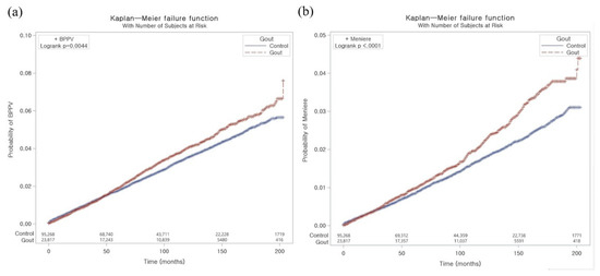The Kaplan–Meier failure curve and cumulative incidence function for the occurrence of BPPV and Meniere’s disease during the 200-month period are presented in Figure 2. The rate of BPPV was significantly higher in the gout group than in the control group (p = 0.0044). According to the log-rank test, individuals with gout had a significantly higher cumulative incidence of Meniere’s disease than those in the comparison cohort (p < 0.001).
