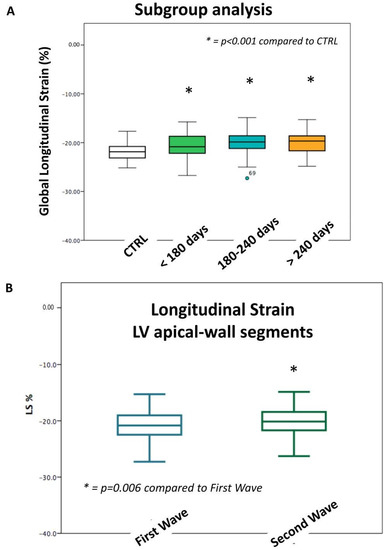 3.4. Left Ventricular Longitudinal Strain According to Different Pandemic Waves