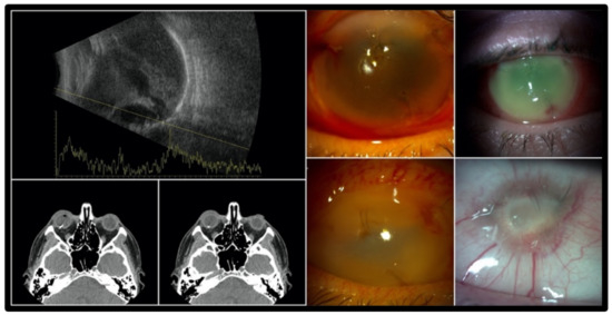 Imaging and clinical follow-up of the IOFB complicated with pan-ophthalmitis leading eventually to the eyeball phthisis (left side of the figure). Ultrasound examination (top left) showing dense vitreous hemorrhage and choroidal elevation. IOFB is visible as a hyperreflective signal in computer tomography (CT) (bottom left).