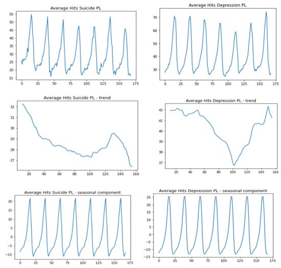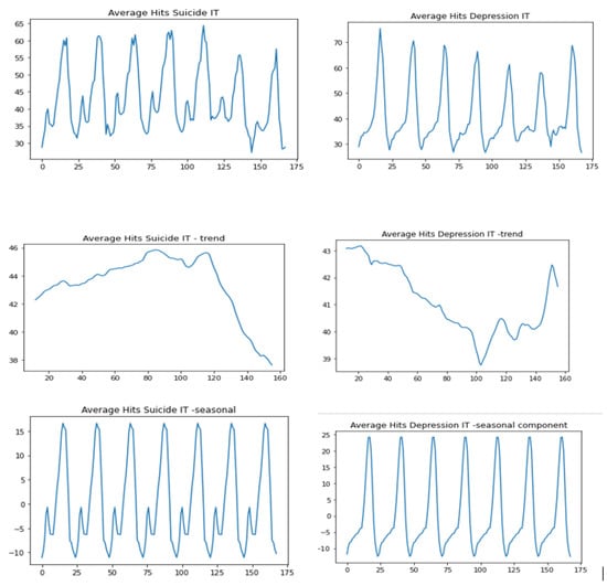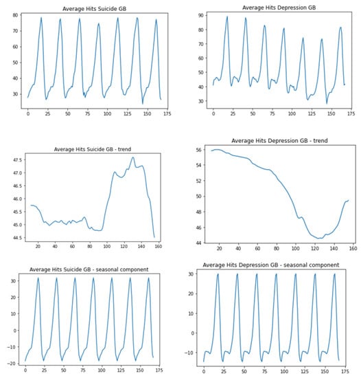 The graphs made with the seasonal-decompose Python function from the statsmodels.tsa.seasonal library are shown in Figure 1. The first line shows the graph for the mean searches for “suicide” and “depression”, the second line of the graph for the trend component, and the third line for the seasonal component.