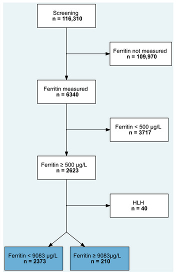 Ferritin is released from various cell types depending on iron levels, as part of the oxidative stress response [1,2], and by macrophages in pro-inflammatory conditions [3]. Ferritin is, therefore, not only a marker of iron status, but also of inflammation [4]. In several diseases and underlying conditions, ferritin may be altered: iron deficiency anemia [5], hemochromatosis [6], and rheumatological diseases [7,8,9,10]. In general ward patients, hyperferritinemia was associated with metabolic syndrome [11], alcohol consumption [12], kidney disease, liver disease, infection, hematological malignancy, hemolytic anemia, and hemophagocytic lymphohistiocytosis (HLH) [13,14]. Hyperferritinemia was found to be predictive for in-hospital mortality in various contexts [15,16,17,18]. It has also gained attention during the SARS-CoV-2 pandemic [19] and in the context of hyperferritinemic sepsis. The latter is part of hyperferritinemic syndromes, which also contain HLH, adult-onset Still’s disease, catastrophic antiphospholipid syndrome, and multi-inflammatory syndrome related to COVID-19 [20,21].