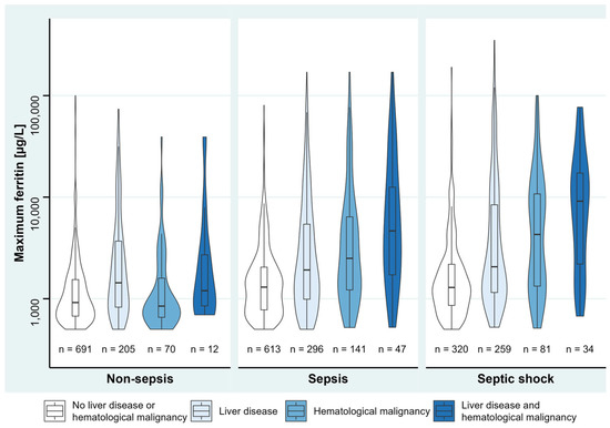 Ferritin levels of sepsis groups stratified by the presence of liver disease and hematological malignancy. Violin plots show data distribution and enclosed boxplots show median with quartiles (25–75%). Whiskers below and above show minimum and maximum values, respectively. For improved visualization, y-axis is plotted in logarithmic scale. Due to various numbers of ICD-10 codes in each single patient, patients partially overlap between the disease groups.