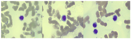 Morphological analysis was performed on peripheral blood, showing the presence of 50% lymphoid cells with intermediate–high nucleus/cytoplasm ratio, loose chromatin, rare nucleoli, basophil cytoplasm, and peripheral hairy protrusions (Figure 1).