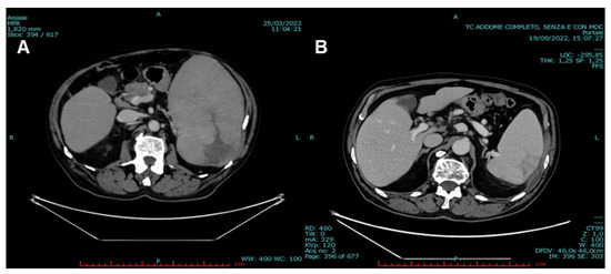 (A) CT scan at diagnosis showing spleen enlargement (lateral × transversal diameter, 21 × 12 cm) with hypodense, irregular parenchymal areas. (B) CT scan re-evaluation after six months of therapy showing a significant reduction in spleen size (lateral diameter, 12 cm) and in hypodense parenchymal areas.