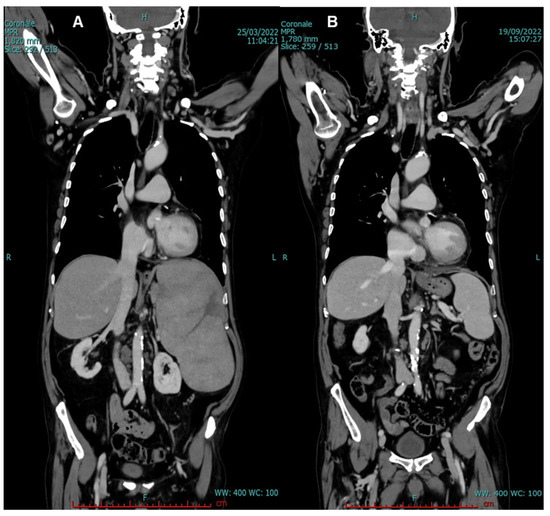 V600E BRAF mutation was detected by next-generation sequencing (NGS). BM biopsy confirmed the presence of hairy cells (60% of total examined cells), and HCL diagnosis was made. Total-body CT scan was also performed, and severe splenomegaly (longitudinal diameter (LD), 21 cm; and transversal diameter (TD), 12 cm) was documented. Moreover, large, hypodense, irregular areas within splenic parenchyma were observed, suggestive of initial splenic rupture, supported by the presence of a peri-splenic fluid. Several lymph node enlargements were observed: at hepatic hilum (maximum diameter, 2.6 cm), interaortocaval, and left paraaortic areas (maximum diameter, 1.3 cm) (Figure 2A and Figure 3A).