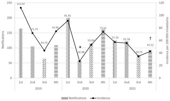 Number of ME notifications and incidence rates per quarter (Catalonia, 2019–2021). Significant differences in incidence: * vs. second quarter of 2019, † vs. fourth quarter of 2019 (p < 0.05).