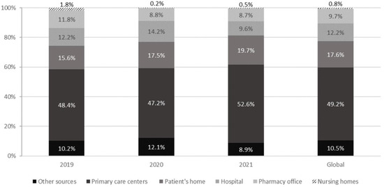 Figure 2 shows the reported MEs by places of detection. We detected MEs more frequently in primary care centers, followed by the patient’s home, hospital, other sites, pharmacy office, and nursing homes. No statistically significant differences were observed throughout the three-year study between the places where MEs occurred.