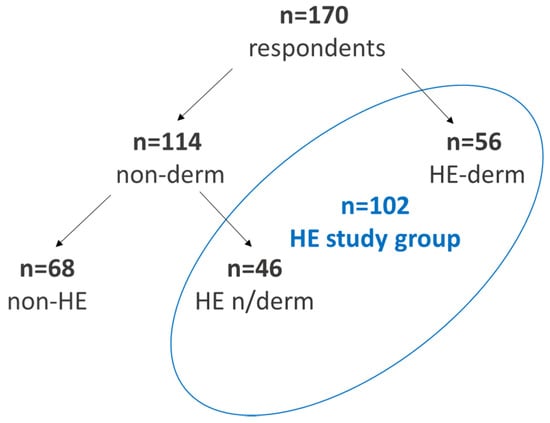 The second study group, classified as non-derm, included 114 respondents (67.06%) who have never been diagnosed by physician with hand skin diseases. The non-derm group was divided in two subgroups: non-HE (n = 68/114, 59.65%), in which no respondent declared the appearance of any symptoms of hand eczema, and HE n/derm (n = 46/114, 40.35%), in which symptoms of hand eczema appeared. Analyzing both groups (non-derm and HE-derm) allowed for the HE-study group (102/170, 60.00%) to be distinguished. These participants were distinguished according to the reported symptoms as individuals with hand eczema. We chose to place these participants in the HE-study group based on the definition of HE regardless of the fact that they had not seen the physician but the symptoms mentioned by the respondents lasted longer than expected and did not disappear spontaneously []. The results are, therefore, more precise and responses from the study participants are more accurately evaluated.