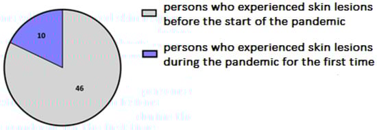 Out of the participants from the HE-study group currently experiencing hand skin lesions, 56/102 (54.90%) reported that, before the COVID-19 pandemic, they had hand skin lesions, while 46/102 (45.10%) persons had no hand skin problems before the outbreak of the pandemic.